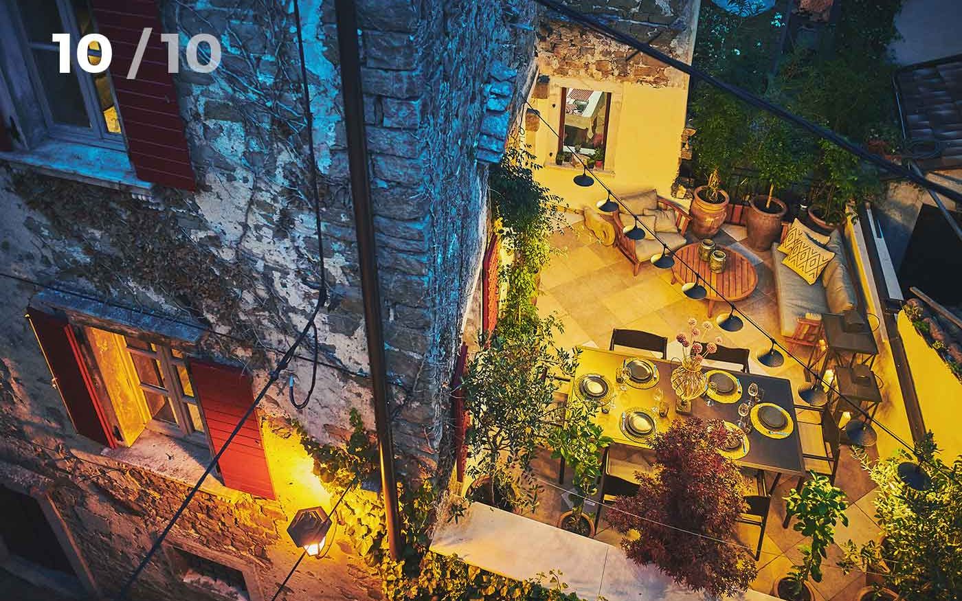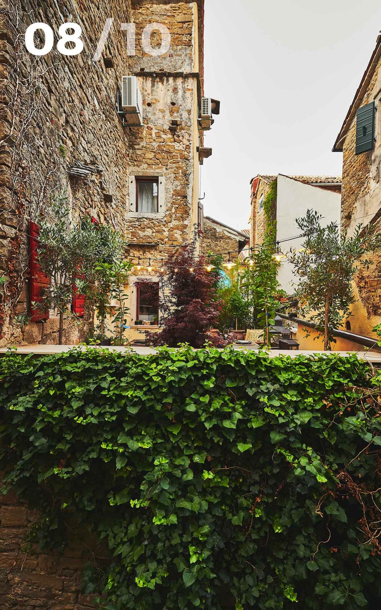 Ispred kuće stvoren je mediteranski zeleni ugođaj, sa pomno biranim mediteranskim biljkama, idealno mjesto za večernju čašu vina uz svijecu i uz note i glasove nekih od muzičara, koje samo prirodno struje ulicama Grožnjana.